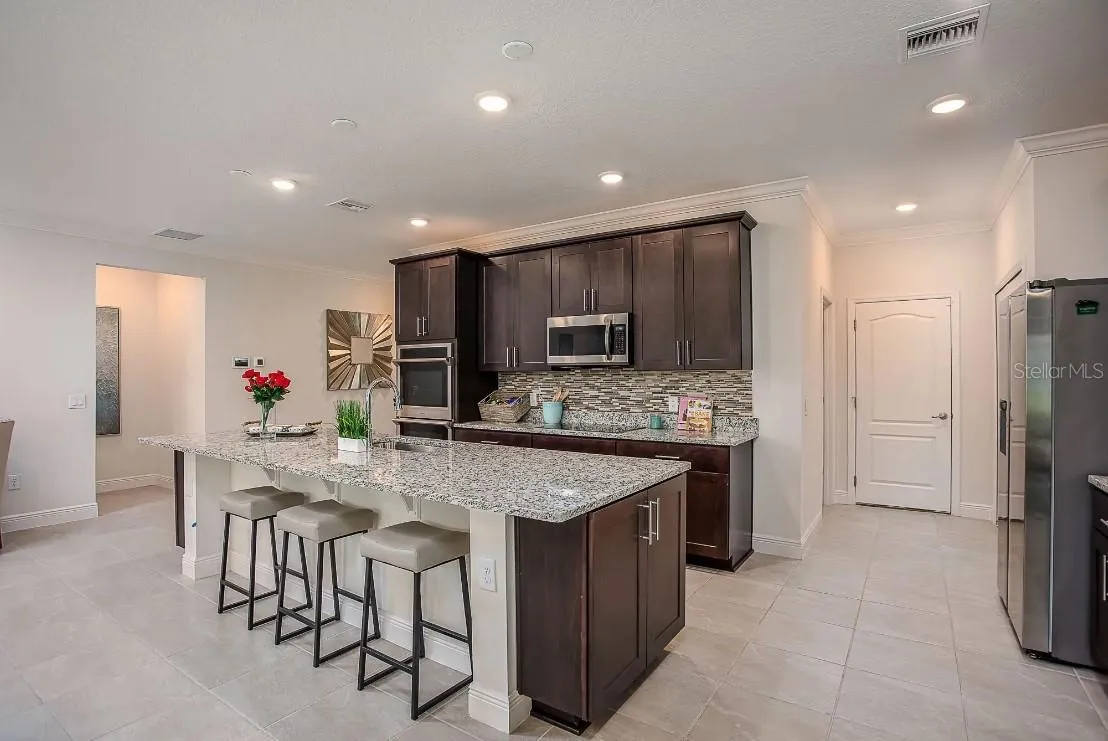 At the heart of the home, the chef-inspired kitchen features granite countertops, upgraded cabinets, a tile backsplash, and a large island with built-in shelving and an eating bar—perfect for entertaining. A full line of stainless steel appliances completes the space, while the bright breakfast nook with an additional window creates a cozy spot for casual meals.