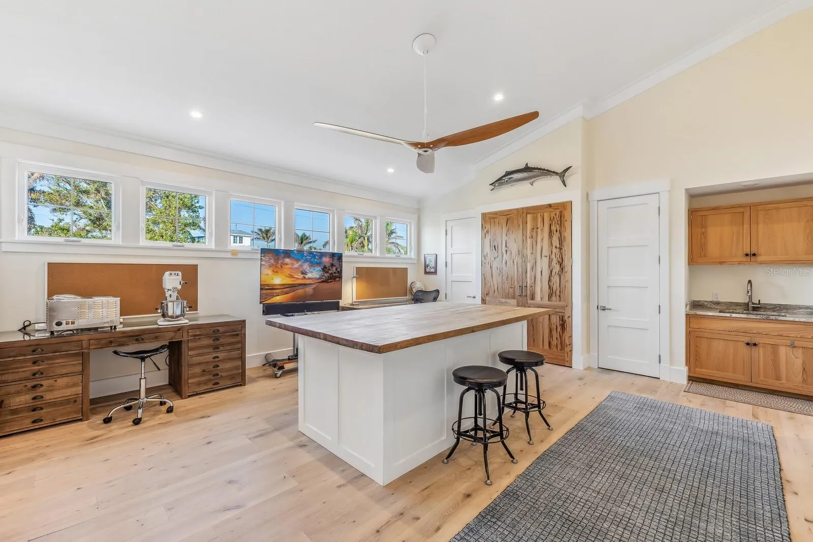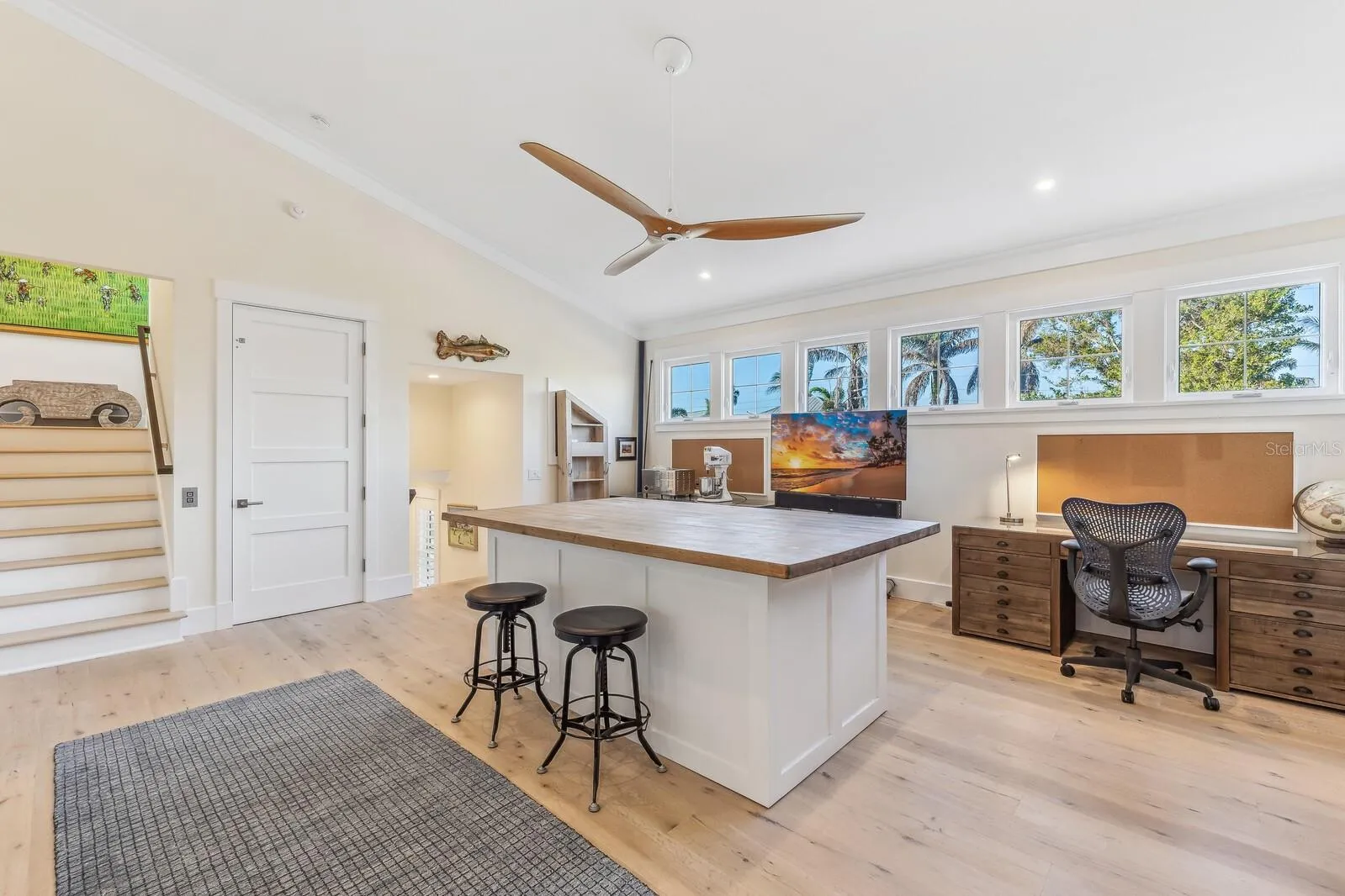 Welcome to an extraordinary coastal residence in the historic village of Boca Grande. This meticulously crafted home has an impressive 5,036 square feet, five bedrooms (the first-floor bedroom could be a den or office with direct access to a screened porch), and five bathrooms. This sturdy and elevated home on the natural “crown” of the island has not suffered any hurricane damage from wind or water. The home and the setting epitomize small island living. This remarkable home features an open floor plan, custom woodwork and oak flooring. The gourmet kitchen features professional-grade appliances including a Subzero refrigerator, a 4 burner Wolf stove with griddle, Miele wall steam oven, and an Asko dishwasher. A custom-designed breakfast bar, walk-in pantry, and an innovative Miele coffee bar cater to both daily living and elegant entertaining. This home features an 11’ curved “live edge” tiger maple bar with a bar sink, refrigerator, ice machine and custom cabinetry. Wine connoisseurs will appreciate the 100+ bottle custom chilled wine closet. The bar and adjoining lounge areas have LED “star constellation” lighting for a clean and enchanting ambiance. The bar and lounge look out through large disappearing sliding-glass doors to the coral stone patio, outdoor wood fireplace and canal, inviting seamless indoor-outdoor living with highly desirable southern exposure. Practical luxury abounds with an elevator, impact glass windows and doors, Hardi Plank siding, and a metal roof ensuring both comfort and security. The oversized garage accommodates both vehicles and a golf cart, perfect for exploring the charming village surroundings. The private den/office/bedroom, separate formal dining room, library, and bonus room offer versatile spaces for work and leisure. The home features a formal dining room that could be used alternatively as a music conservatory or a large, sunny office. There is a “bonus” room on the midlevel that has a full laundry with folding table and drying closet, a number of cleverly hidden spaces for storage, and a vaulted ceiling central space for work or leisure. The second floor features a gallery hallway and library with access to an outdoor balcony. For sailing or powerboat enthusiasts, the property’s 80’ dock and 10,000-pound boat lift provide direct, deep-water access to Florida’s pristine waters, without height-restrictive bridges. The home’s location on the nearest canal to the center of town, offers boaters optimal convenience and privacy. The dock itself has a swim ladder and a custom-designed pivoting platform for safely launching small crafts like paddle boats, kayaks and SUP boards. Snook and other game fish can be caught right off the sunny dock, and the dock has a fish-cleaning station. Thoughtful additions include electric screens, a hidden wall safe nook, custom closet wooden built-ins, pocket doors, Plantation shutters, motion detection lighting, and innovative storage solutions demonstrate the meticulous attention to detail throughout this exceptional property. This residence stands as a testament to luxurious coastal living, where every element has been carefully considered to create an unparalleled living experience.