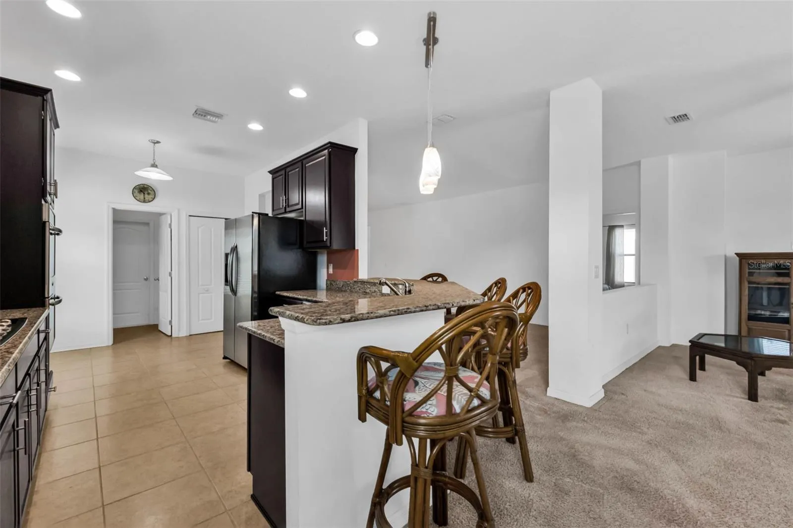 This charming 3-bedroom 2-bathroom, 2 car garage, salt water heated pool with a paver driveway is located in the gated community of River Club. This home has an open floor plan with a family room, living room and dining room that is perfect for entertaining. The large kitchen has wood cabinets, granite countertops, stainless appliances and a large pantry. The tiled kitchen is equipped with double built-in oven and with convection five burner cook top. Pull up your bar stools and sit at the kitchen counter and enjoy great dinner conversations. The primary bedroom is large enough to fit your king-sized bedroom set and has a walk-in closet. The on-suite bathroom has double sinks, tile shower and a nice soaking tub. The bathroom also has access to the lanai and pool area for easy access. This bathroom doubles as a pool bath. The two guest bedrooms are in a separate area of the home to allow you and your guests privacy. The guest bathroom is equipped with a shower/tub combo.