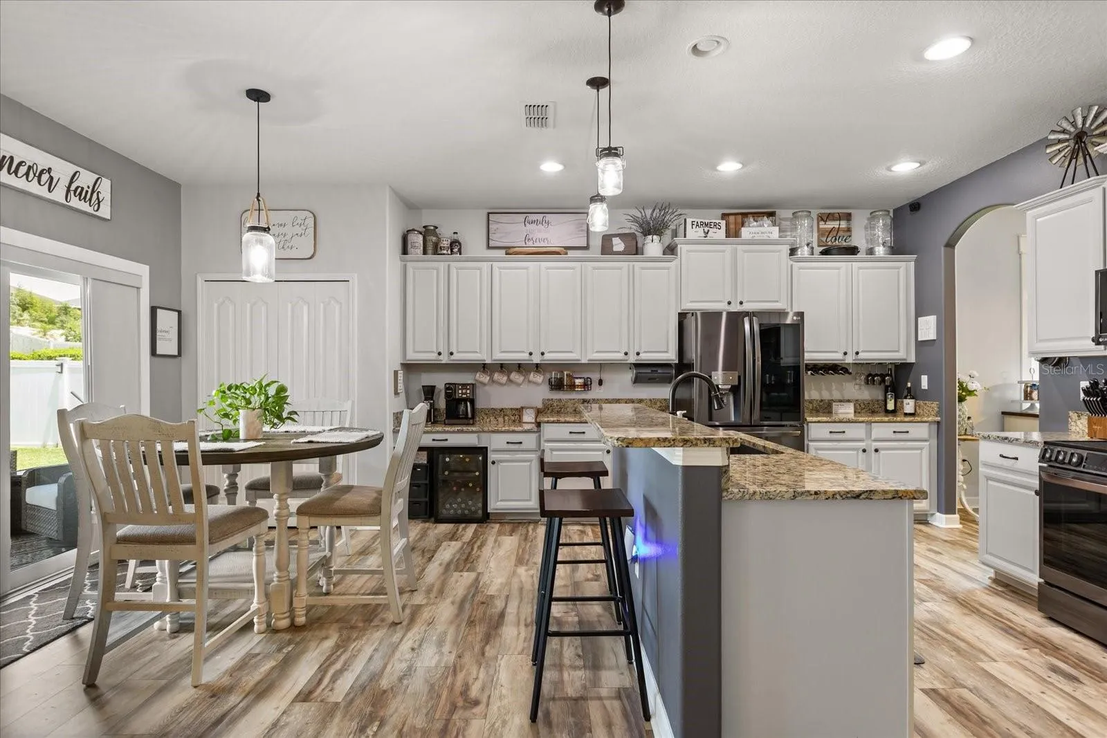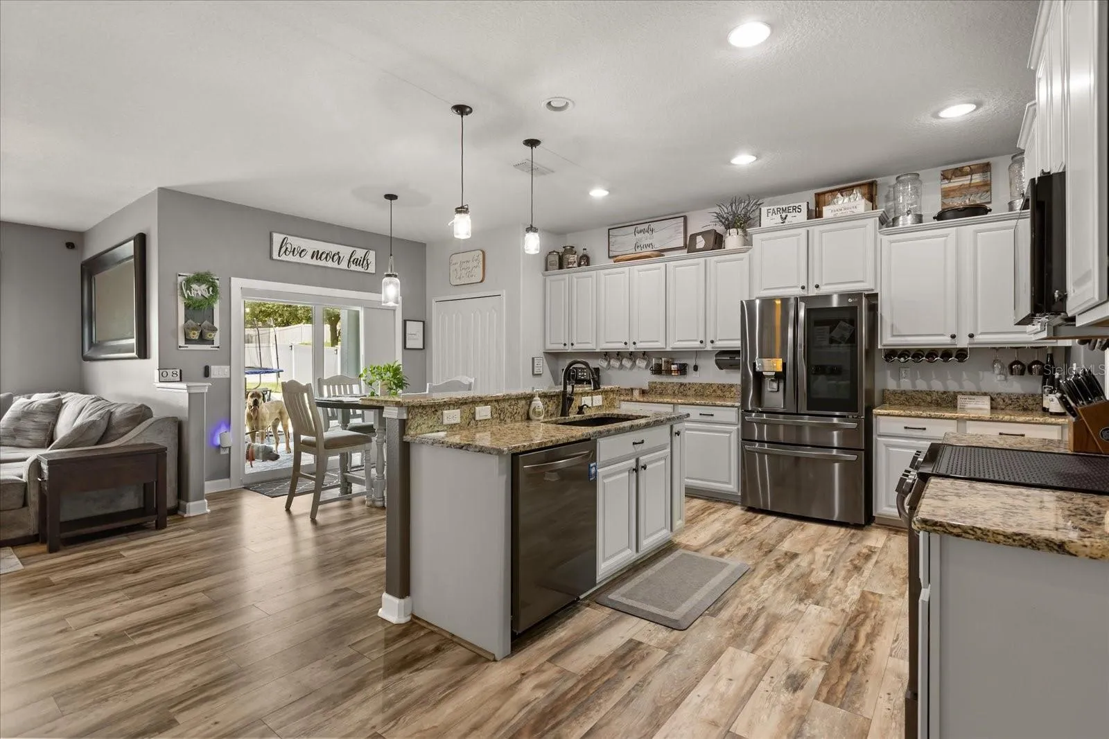 Situated on a corner oversized lot with a private mailbox, this beautifully upgraded home offers endless interior and exterior features! Step inside to find rounded corners throughout, new luxury vinyl plank flooring that is waterproof and scratch-resistant with a lifetime warranty, new carpet, and an electric fireplace in the living room. The kitchen showcases granite countertops, freshly painted cabinets, and stainless steel LG appliances that are less than a year old.