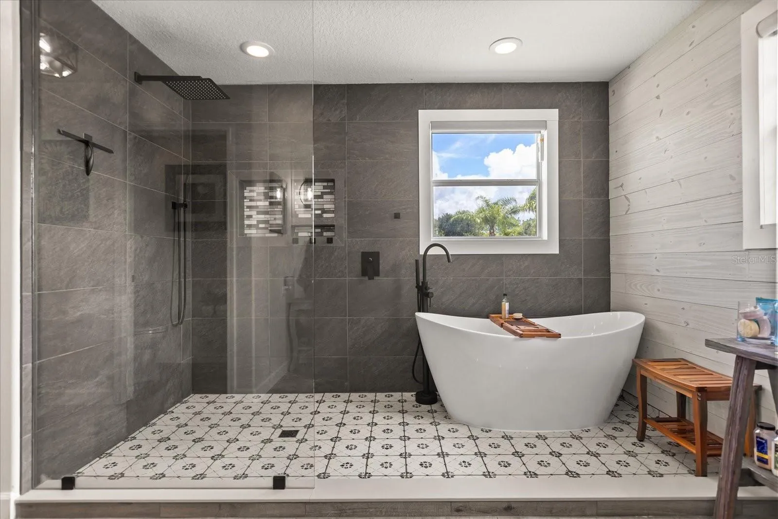 The primary suite features two walk-in closets and a newly renovated spa-like bathroom with dual sinks, soft-close cabinetry, a soaker tub, open glass shower with waterfall shower head, ceramic tile, private water closet, and a stylish bi-fold barn door oversized linen closet. Both the primary bedroom and living room are equipped with remote-controlled automated blinds.