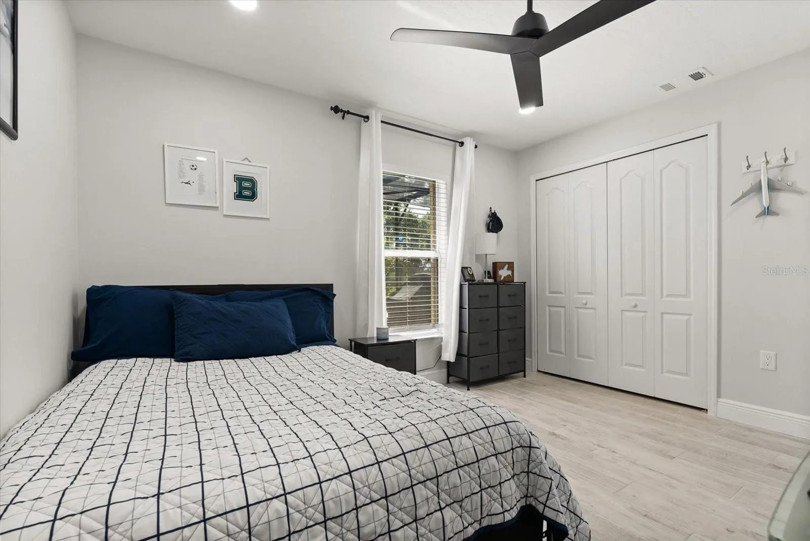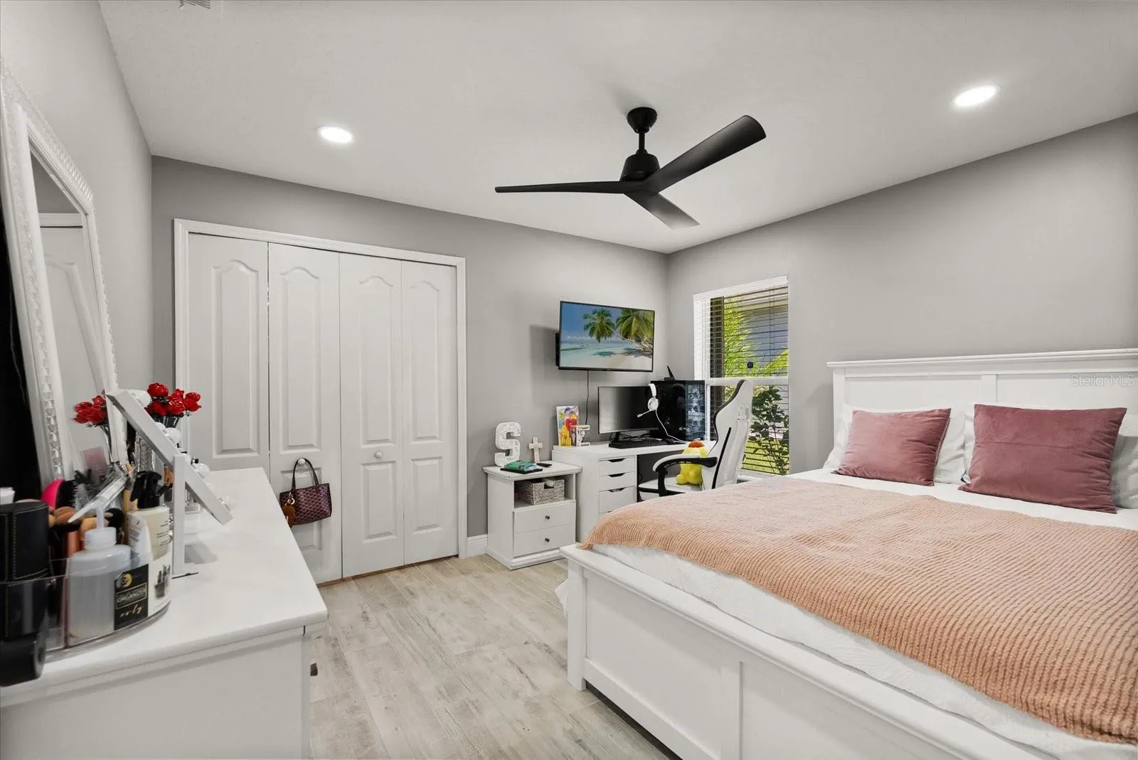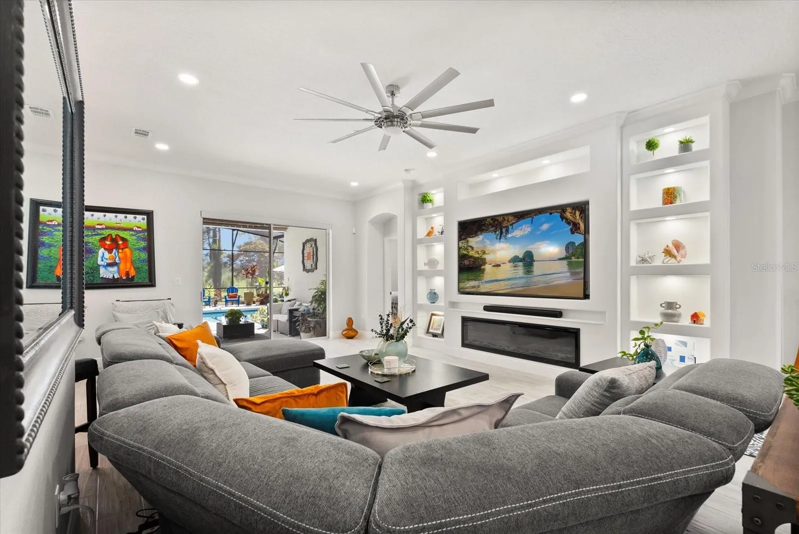 Inside, thoughtful updates and modern finishes make every space shine. The remodeled kitchen (2020) features stylish finishes and flows into the bright living area, anchored by a built-in entertainment center with electric fireplace (2025). New ceramic tile floors (2025), fresh interior and exterior paint (2024–2025), updated lighting, fans, and electrical outlets add to the home’s move-in-ready appeal. The split floor plan includes a spacious primary suite with two walk-in closets and a spa-like bath, fully remodeled in 2025, complete with soaking tub, separate shower, and upgraded exhaust fans with speakers. Every bedroom offers custom built-in closets, providing smart storage solutions and a touch of luxury throughout the home. Three additional bedrooms, a second full bath, and an office provide flexibility for family, guests, or work-from-home needs.