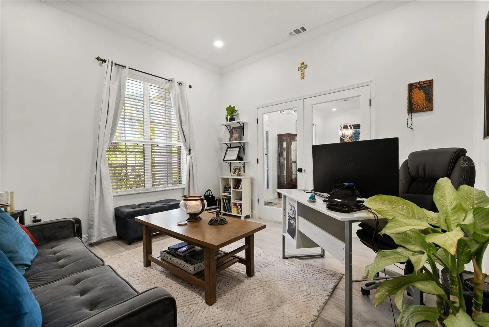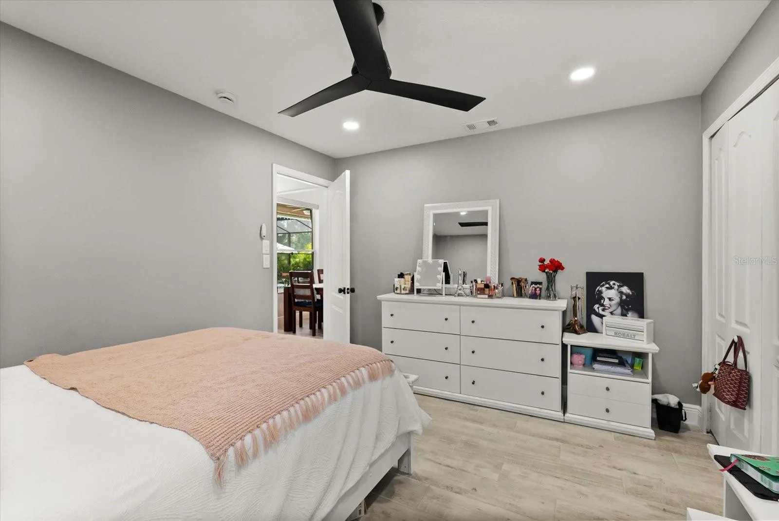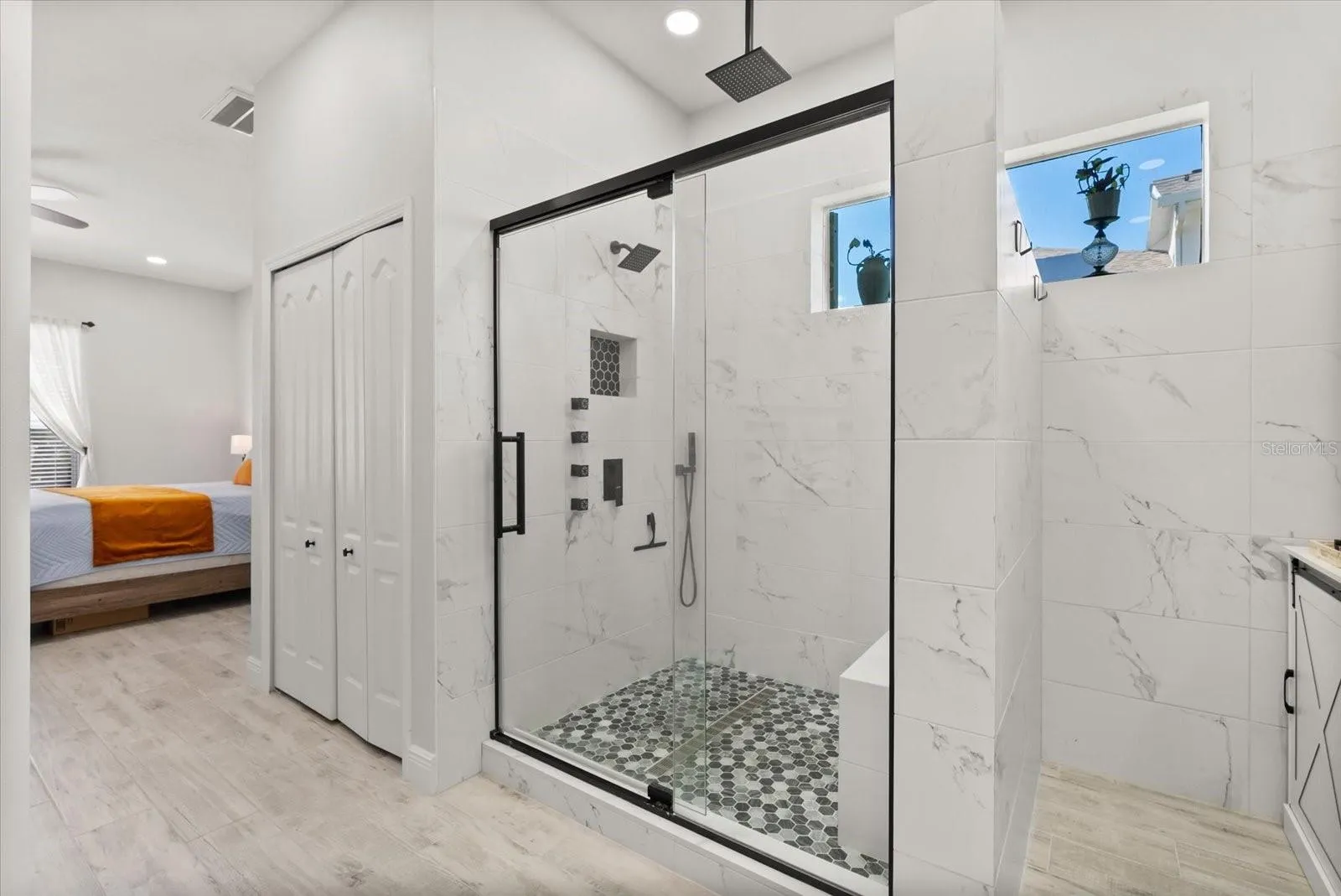 Inside, thoughtful updates and modern finishes make every space shine. The remodeled kitchen (2020) features stylish finishes and flows into the bright living area, anchored by a built-in entertainment center with electric fireplace (2025). New ceramic tile floors (2025), fresh interior and exterior paint (2024–2025), updated lighting, fans, and electrical outlets add to the home’s move-in-ready appeal. The split floor plan includes a spacious primary suite with two walk-in closets and a spa-like bath, fully remodeled in 2025, complete with soaking tub, separate shower, and upgraded exhaust fans with speakers. Every bedroom offers custom built-in closets, providing smart storage solutions and a touch of luxury throughout the home. Three additional bedrooms, a second full bath, and an office provide flexibility for family, guests, or work-from-home needs.