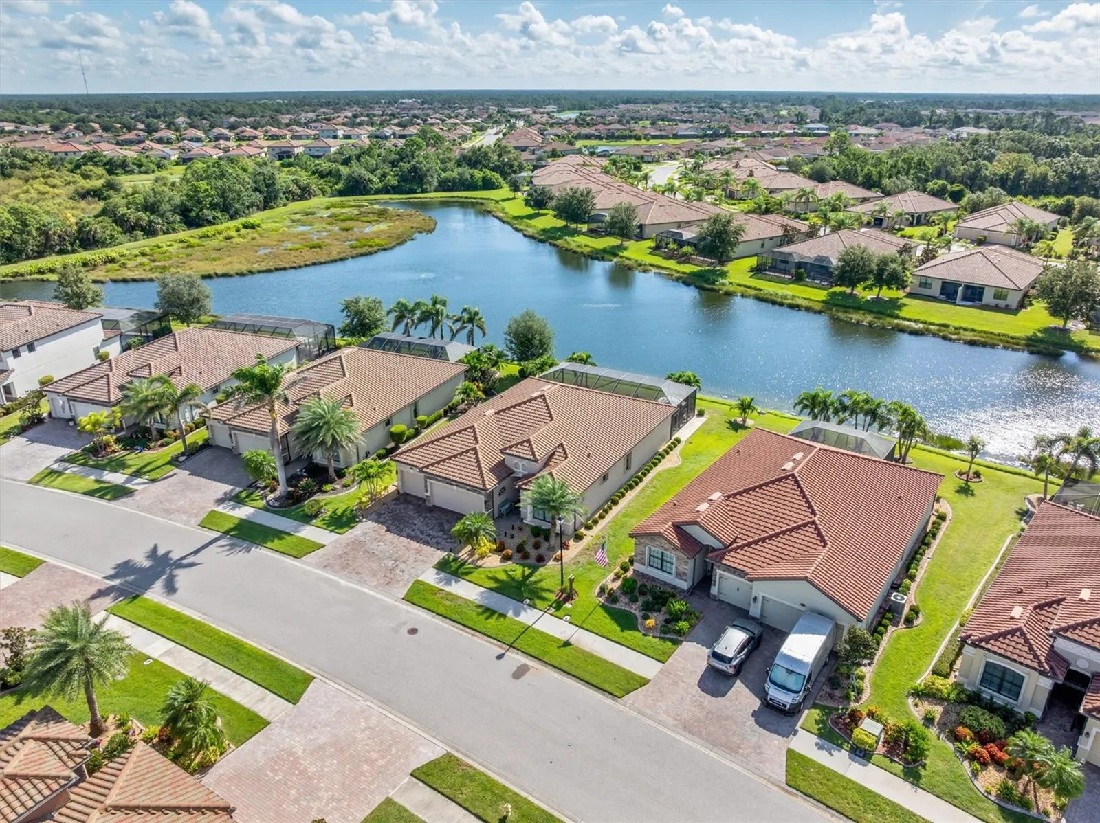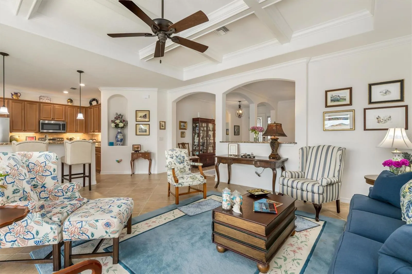 From the curb, the home makes a lasting impression with its tile roof, stacked stone accents, lush enhanced landscaping, and a wide paver driveway that provides ample parking for family and guests.