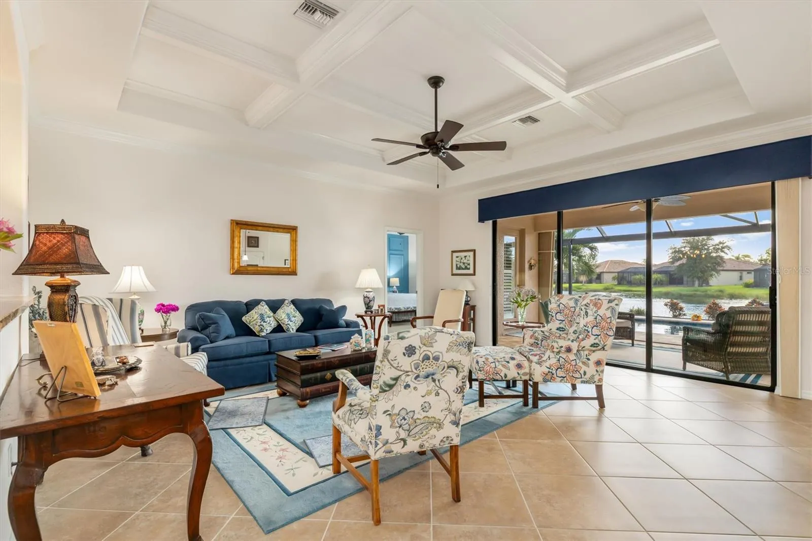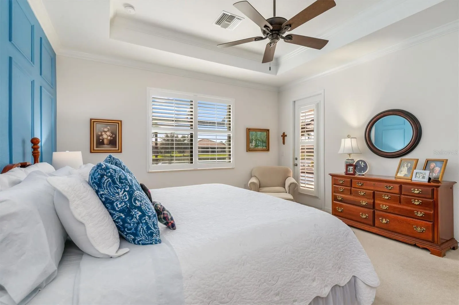 Inside, the home has been upgraded to include PLANTATION SHUTTERS, COFFERED and TRAY ceilings, accent wall and decorative trim in the primary bedroom, custom ceiling fans and tile flooring in living areas.