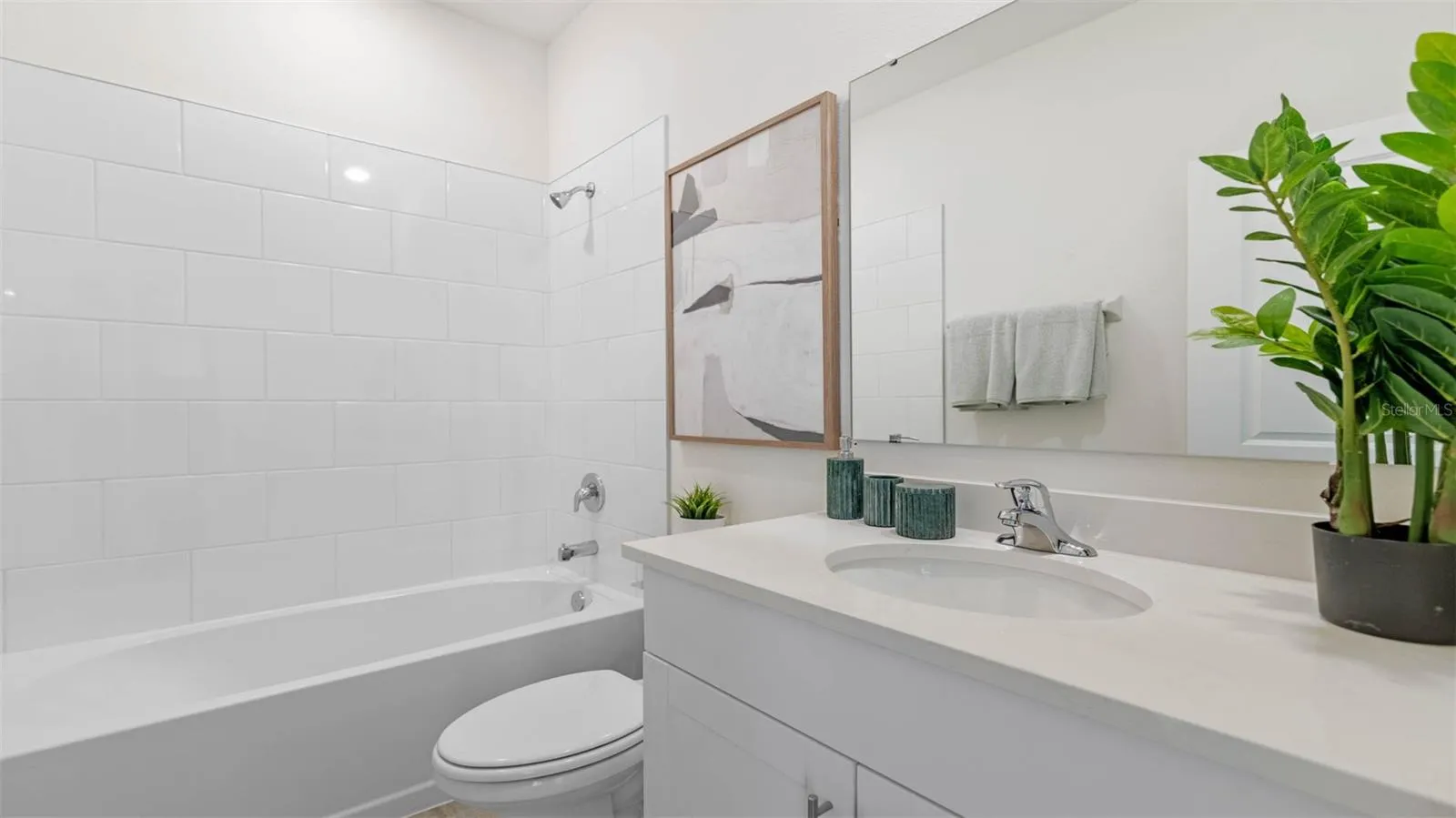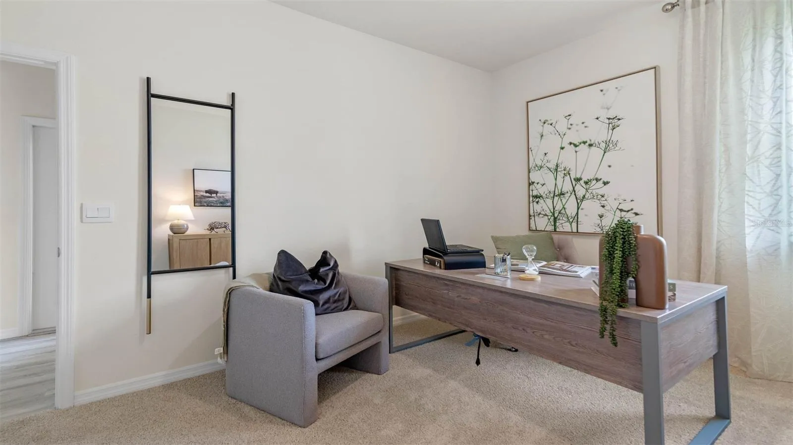 As you enter the foyer, you are greeted with two bedrooms and a full bathroom. The well-appointed kitchen overlooks the dining room and features an island with bar seating, beautiful quartz countertops and stainless-steel appliances. A versatile nook is located off the kitchen and can be adapted to fit your needs.
