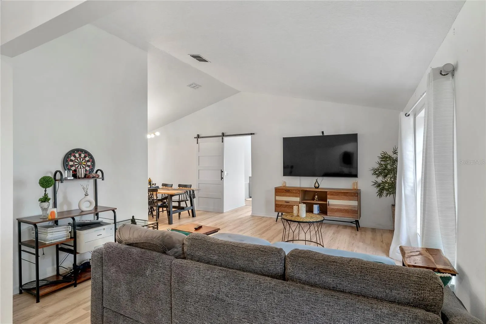 Inside, the open-concept layout is bright and airy, filled with natural light from skylights and large windows. The space feels modern yet cozy, featuring luxury vinyl plank flooring, fresh paint (2024), and smart home features throughout including a Ring system, smart thermostat, and voice-controlled lighting.