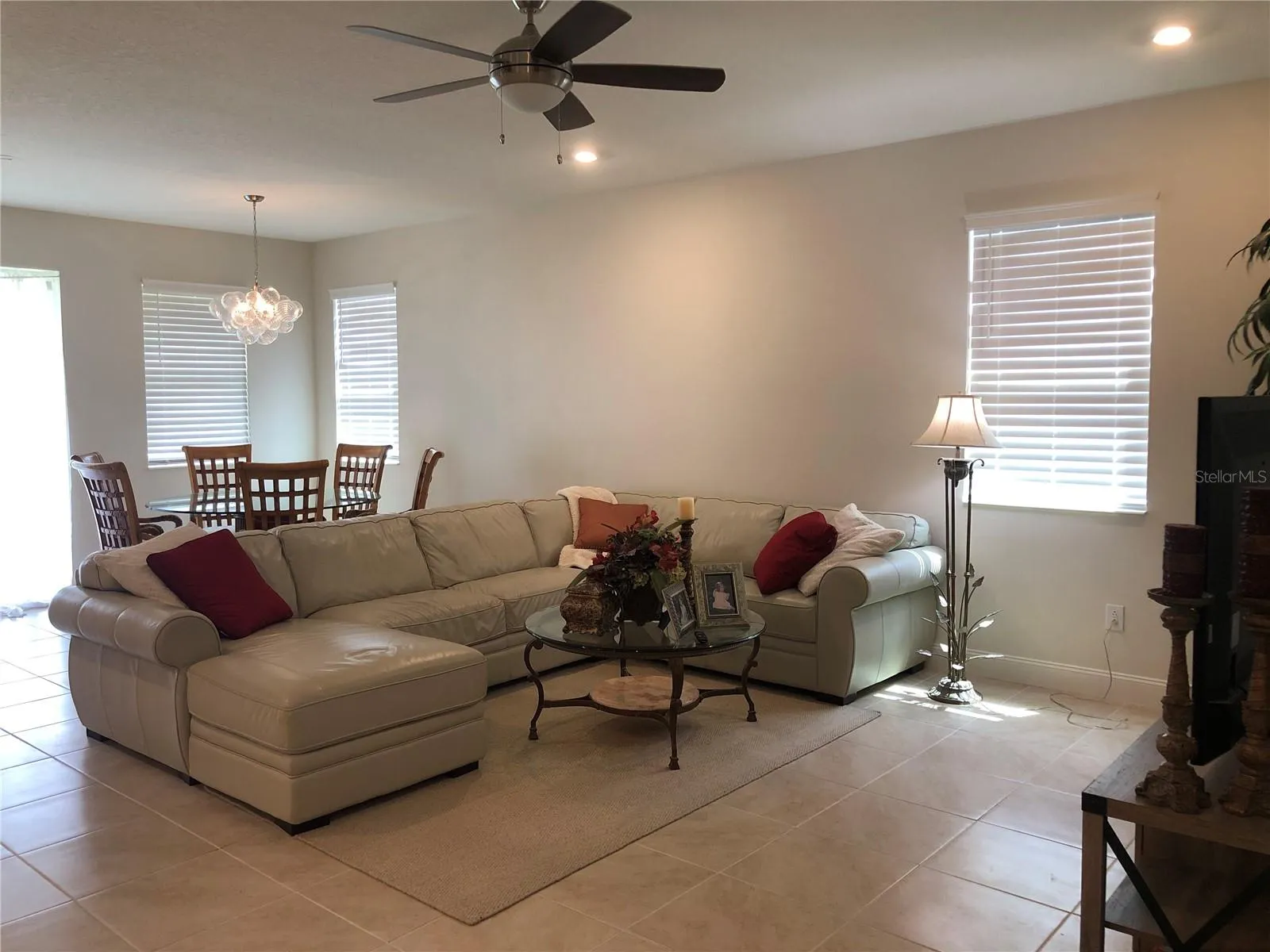 Welcome to this new construction home (built 2024) in the brand-new Riverstone community in highly desirable Land O Lakes. Enter through a covered front porch into an open floor plan with expansive ceilings over 9 ft tall. Off the entry are the designated laundry room, 3 secondary bedrooms, and a full bath with a large linen closet. The kitchen, dining room, and living room combine in an open layout with tile flooring throughout the living and wet areas. The kitchen features 42-inch upper cabinets with crown molding, pantry, large island with granite countertops and pull-out trash and recycling, rectangular single basin undermount sink with pull-down faucet, microwave that is vented to the outside, dishwasher, stainless steel refrigerator and garbage disposal. Past the kitchen you will find the large 14 x 18 master bedroom with a large walk-in closet with custom shelving. The master bath has a dual sink vanity, walk-in shower with tile surround, separate water closet and a linen closet. Unwind after a long day on the covered back patio. Enjoy the smart features in this home you can control from your phone including the hybrid water heater that uses heat from the garage and the Ecobee thermostat that has too many features to list. The designated laundry room includes a washer and dryer. Both the front and back of the home include motion detection flood lights with cameras you can view from your phone.