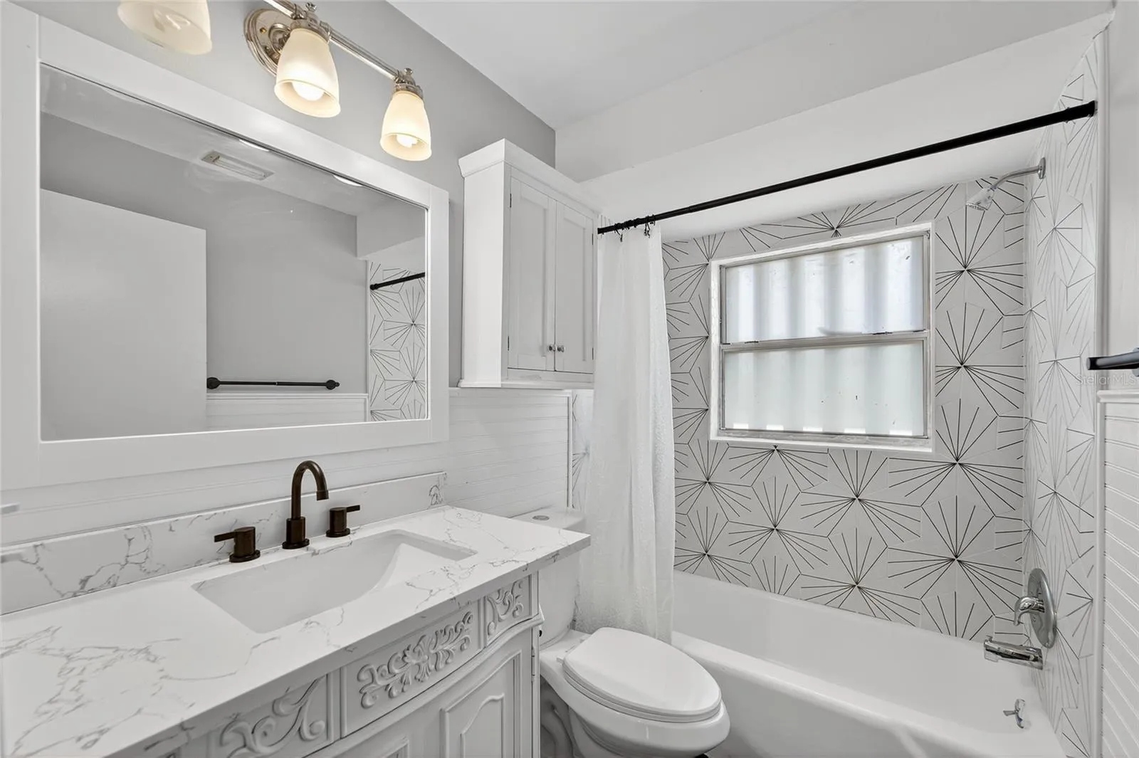 The home has been completely transformed with a stylish, all-new kitchen featuring quartz countertops, lazy-Suzan in the corner cabinet, a sleek backsplash, a spacious island, a large picture window, and a deep stainless-steel sink—perfect for entertaining or everyday cooking.