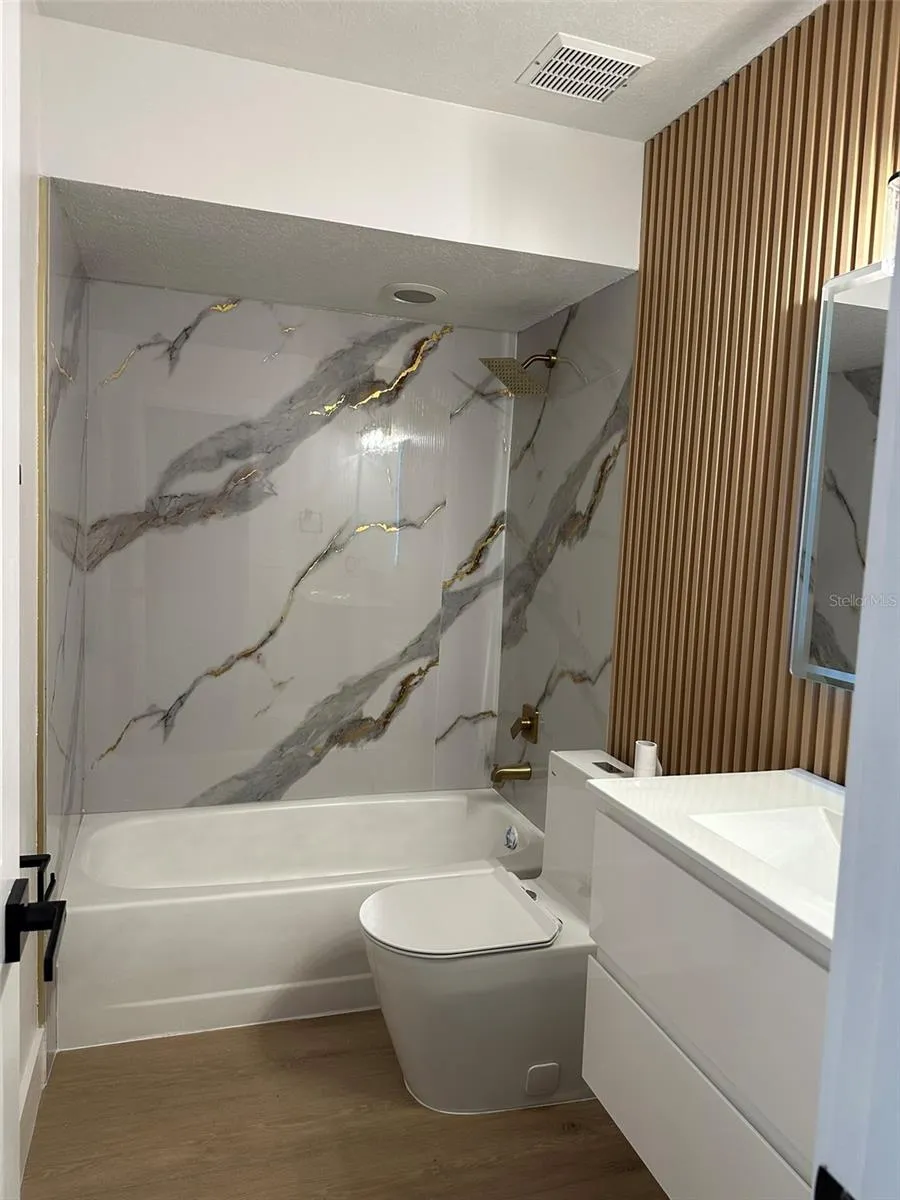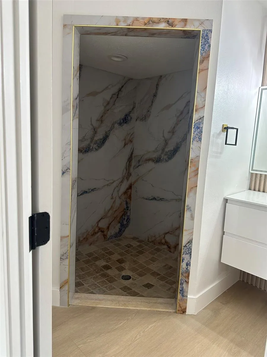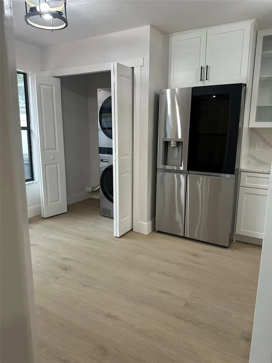 You will be inspired by the feeling of spaciousness as a result of the open floor plan. Peace and privacy surround you from the gorgeous front door with its programable lock, to the sweeping living room, dining room, den and kitchen. At the rear of the property, a screened patio provides a warm and functional space for both daily living and entertaining. This is perfect for grilling, outdoor dining, installing a spa or just to enjoy quiet evenings. Be awed by the kitchen’s upgraded designer quartz countertops, solid wood, soft-close cabinetry with glass inserts, ¾ hp garbage dispenser with air switch, pulldown sprayer faucet. Also included are state-of-the-art stainless-steel appliances – refrigerator, 5 burner range with open, microwave and dishwasher. Also included is a stacked washer and dryer for your convenience. Bathrooms are stunning as they feature new modern toilets, vanities, smog-free led mirrors & beautiful shower-wall designs. The bathroom accessories complement the bathrooms as well as.