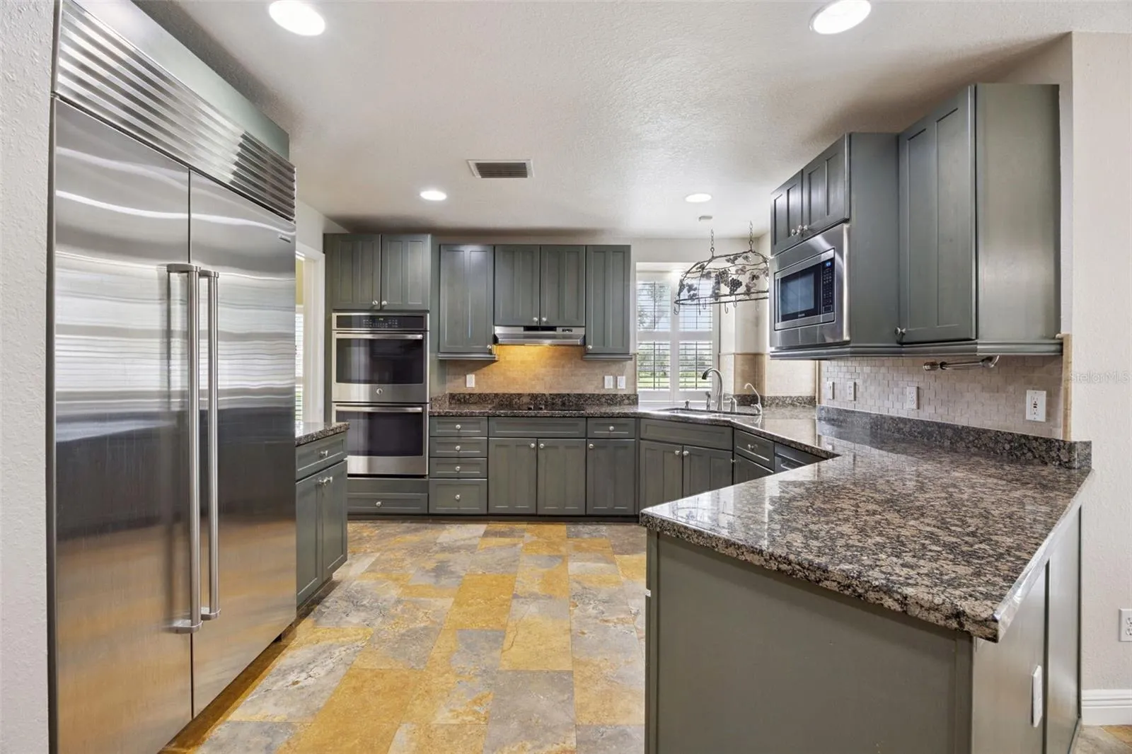 The gourmet kitchen is a chef’s dream, featuring granite countertops, KraftMaid cabinetry, Sub-Zero refrigerator, cooktop, double ovens, and a large pantry. The open design keeps the heart of the home connected to the main living space — ideal for entertaining and family gatherings.