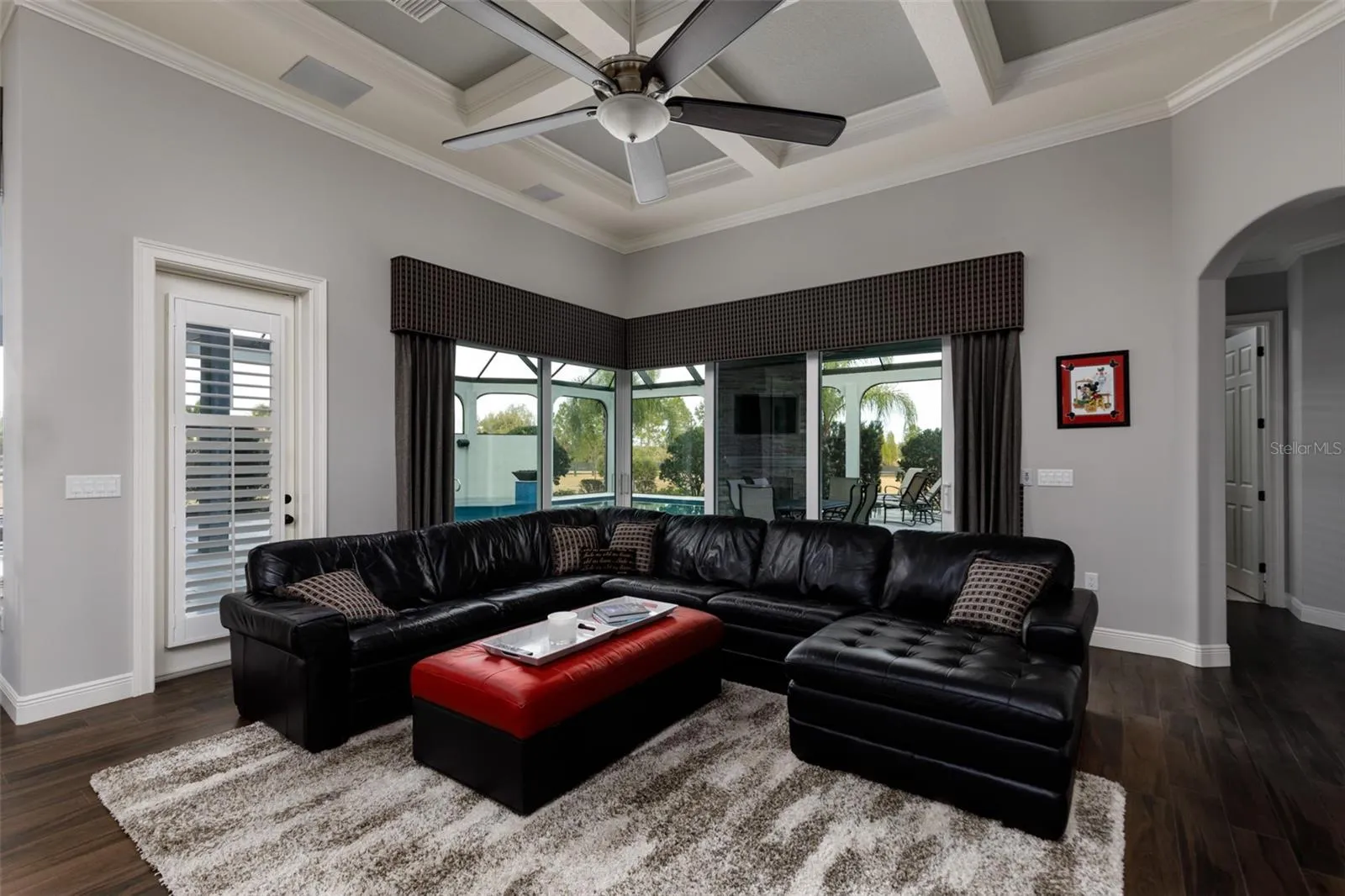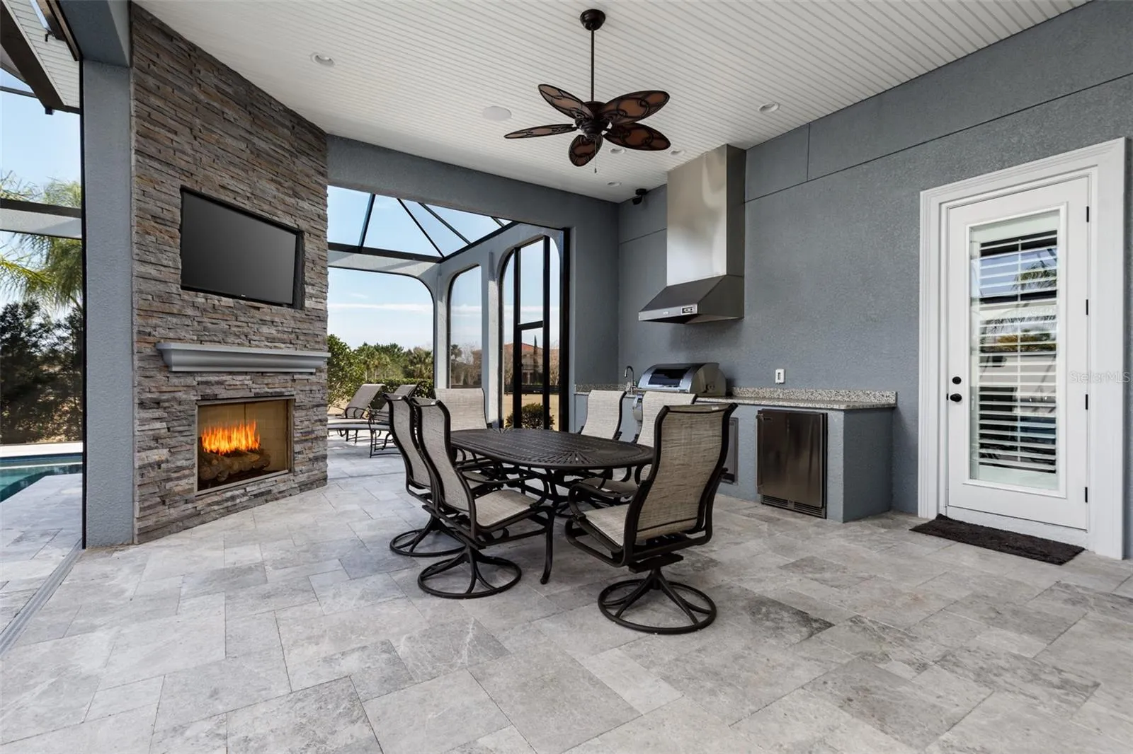 Step into luxury with this stunning Mediterranean-inspired custom home, designed for both comfort and style. From the moment you arrive, the arched details, stone accents, and manicured landscaping set the tone for resort-style living. Inside, soaring ceilings, elegant wood-look tile floors, accent columns, and a marble-trimmed fireplace create an inviting atmosphere, while the Control 4 smart system allows you to manage lighting, pool settings, security, and more right from your phone. The spacious floor plan offers formal and casual living areas, including a formal dining room, office, wet bar, and a cozy living room with fireplace. The owner’s suite is a true retreat with dual walk-in closets, spa-style bathroom with heated floors, soaking tub, and oversized shower built for two. Each additional bedroom comes with its own ensuite bath, offering privacy and comfort for family and guests. A custom theater room provides the perfect space for movie nights or game days. Outdoor living shines here—slide open the glass doors to a fully screened patio with a travertine deck, outdoor kitchen, dining space, fireplace, and a resort-style saltwater pool with spa and fire features. Whether lounging in the sun or entertaining under the covered lanai, this home is built for year-round enjoyment. Located in the exclusive gated community of Stonelake Ranch, residents enjoy access to a lakeside lodge, fitness center, boat ramp, equestrian trails, sports courts, and breathtaking views of Lake Thonotosassa. Just 20 minutes from both Tampa and Lakeland, this estate blends luxury, convenience, and privacy in one perfect package.
