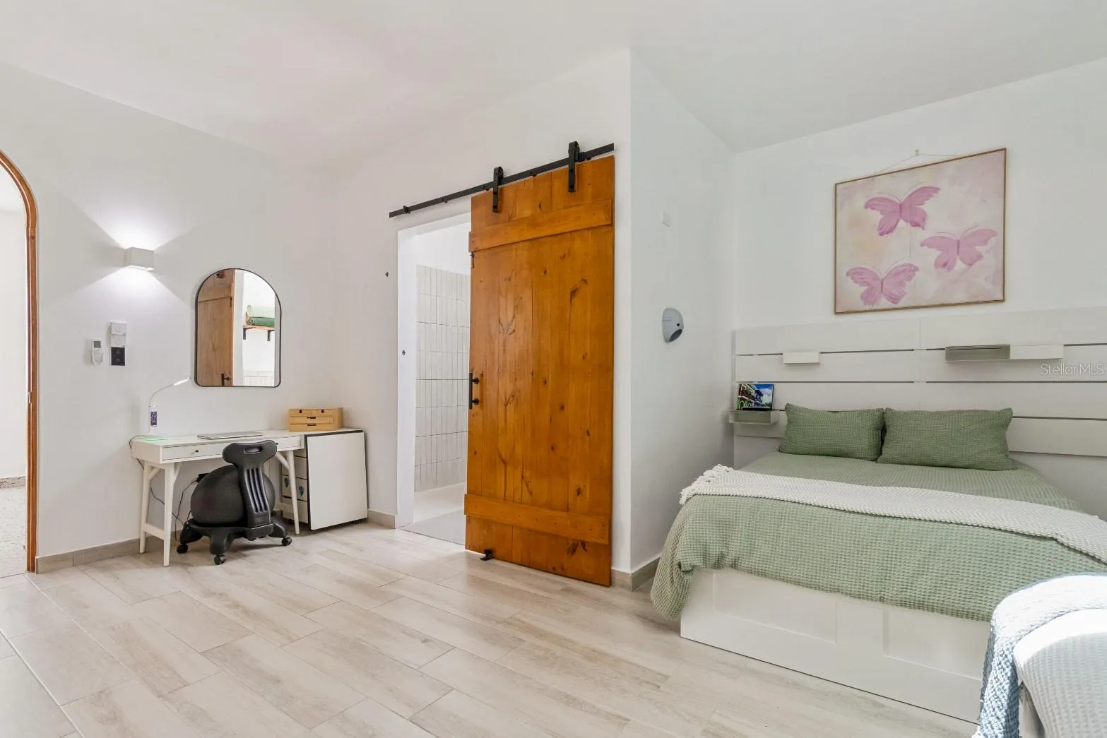 A stunning one-bedroom casita or in-law suite, complete with kitchenette and floor-to-ceiling glass, seamlessly blends indoor and outdoor living. Outside, the private oasis boasts a sparkling saltwater pool, spacious terrace, wet bar, and grill, perfect for entertaining or relaxing in total privacy.
