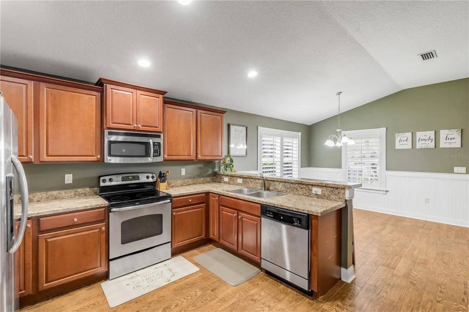 At the heart of the home, the kitchen stands out with its sleek countertops, modern cabinetry, stainless steel appliances, and a breakfast bar that provides the perfect spot for casual dining or morning coffee. The open-concept layout ensures the kitchen flows naturally into the dining and living spaces, making it easy to stay connected whether you’re cooking, relaxing, or hosting gatherings.