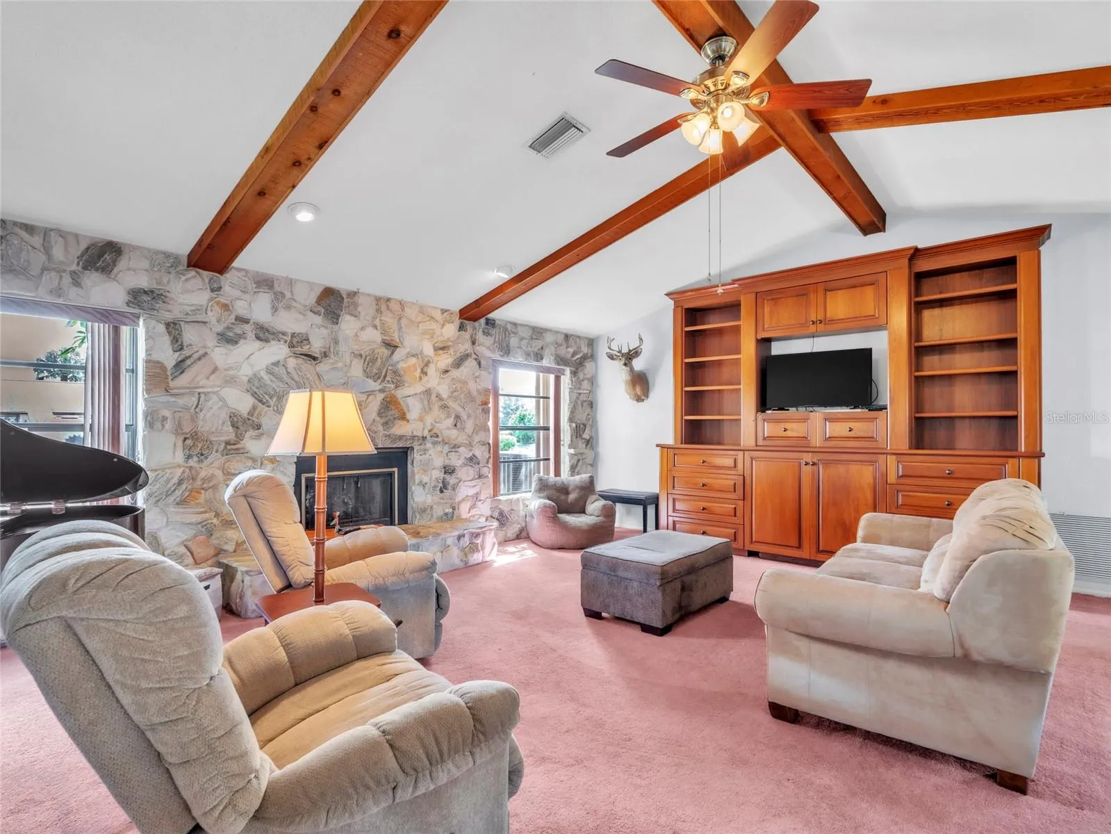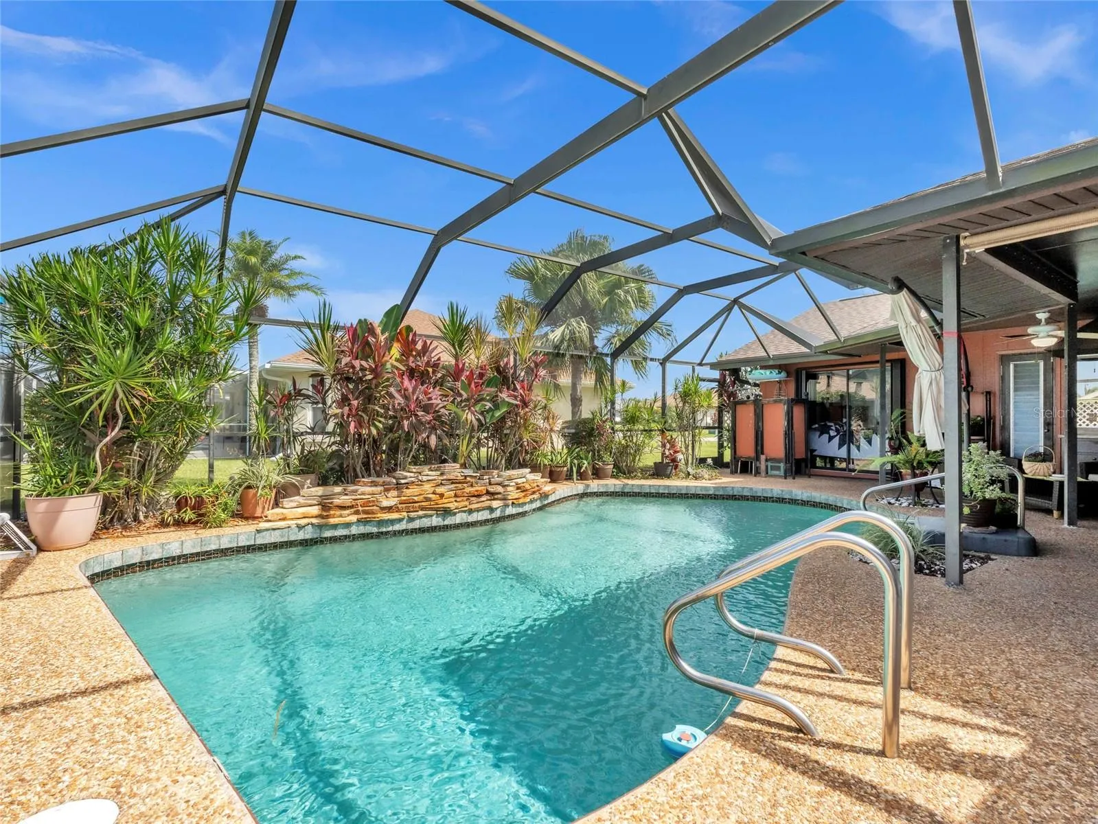 This inviting residence boasts soaring cathedral ceilings, a dramatic stone fireplace, and a bright kitchen featuring quartz countertops and double pantries, all overlooking the private, large, screened freeform pool with a serene stone waterfall. Enjoy theese views from your oversized lanai, or enjoy the walks by the lake in front of this beauty!