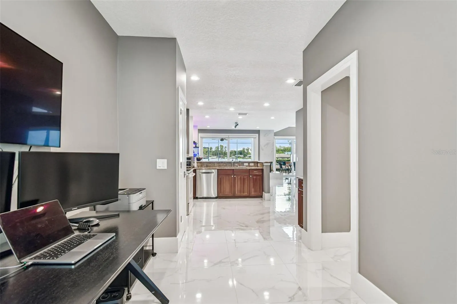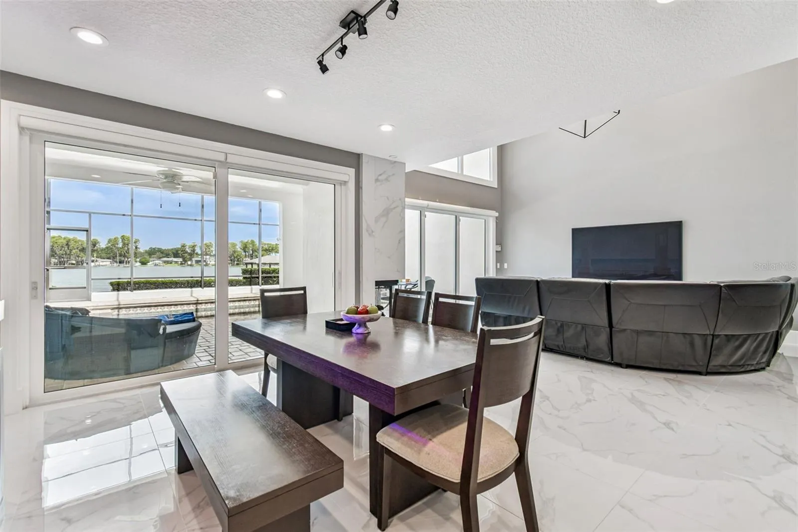 Step inside through a charming courtyard and immediately feel at home. The main level impresses with abundant natural light, upgraded wood-look ceramic tile flooring, soaring volume ceilings, and breathtaking lake views. The spacious family room features double-vaulted ceilings and a cozy fireplace, seamlessly flowing into the formal dining area with direct pool access—perfect for entertaining.